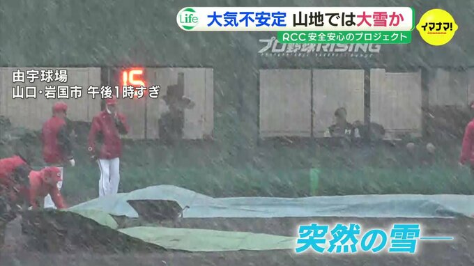 カープ2軍の試合中に突然降り出した横殴りの雪。きょう午後1時すぎ山口県岩国市の由宇球場では、試合は一時中断し、その後、中止となりました。中国地方は、午後になって各地で天気が急変しました。