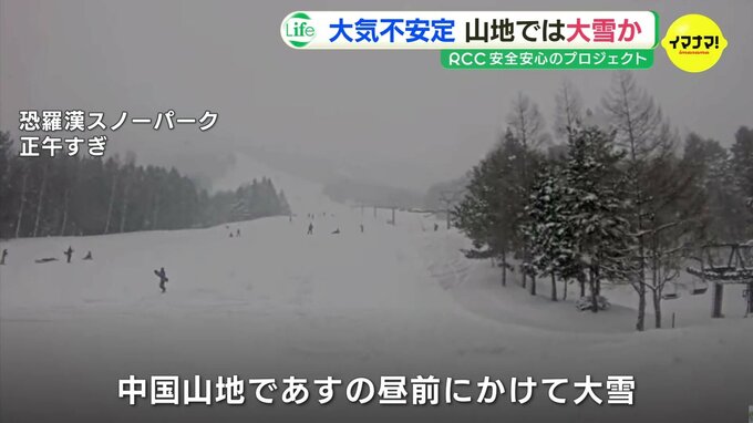 きょうの広島市内は、午前中は青空が広がっていましたが、お昼を過ぎたころから急に雨が降り、風が強まりました。広島県内は、大気の状態が非常に不安定となっています。あす昼前にかけて雪が降りやすくなり、山地では大雪となる見込みです。