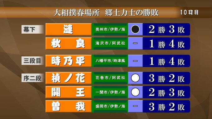 大相撲春場所10日目、郷土力士の取り組みの結果です。17日、負け越しが確定した盛岡市出身で東前頭10枚目の錦木は、玉鷲にはたき込みで敗れました。