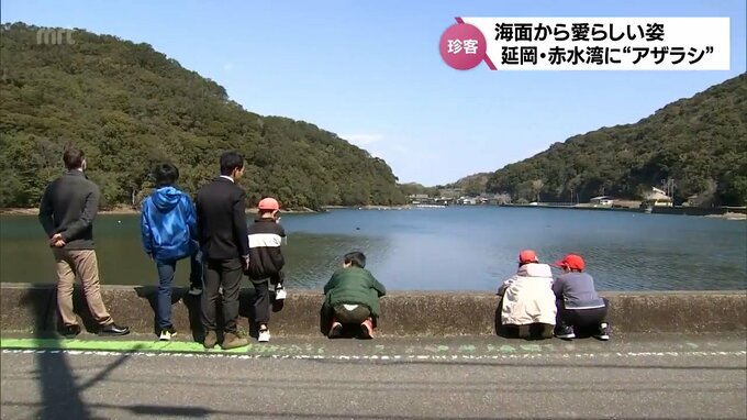 時おり、海面から顔を出す愛らしい姿を見ようと、地元の人たちや近くにある名水小学校の児童たちも集まり、夢中になって探します。