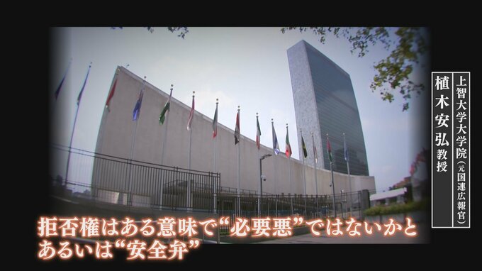 「拒否権がなくなってしまうと、大国が国連から出るという連盟の失敗が再度起きる可能性が強い。当時、常任理事国だった日本も満州事変を機に 脱退する。ドイツもナチスが出てきて脱退する。ですので、拒否権は、ある意味で“必要悪”ではないかと。あるいは“安全弁”」