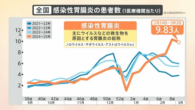 全国の感染性胃腸炎の患者数(1医療機関当たり)は、9.83人(2月24日~3月2日)となり、過去10年で最多となっています。