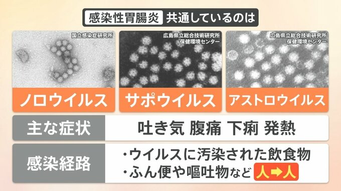 感染経路は、▼ウイルスに汚染された飲食物を口から入れる、▼ふん便や嘔吐物などを介して人から人への感染です。
