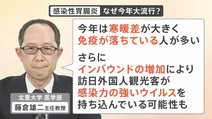 藤倉主任教授によると「今年は寒暖差が大きく、免疫が落ちている人が多い。さらに、インバウンドの増加により、訪日外国人観光客が感染力の強いウイルスを持ち込んでいる可能性もある」ということです。