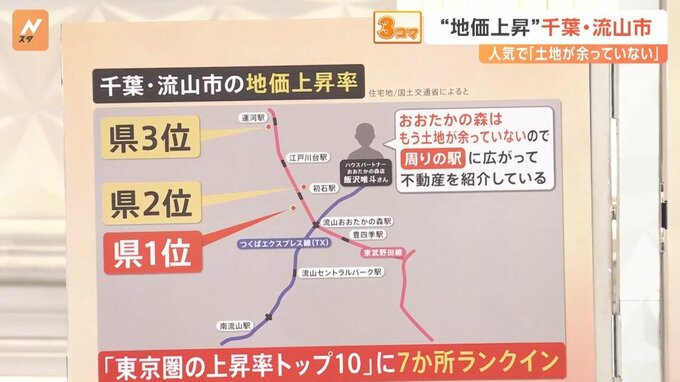 実際、千葉県内においてはおおたかの森駅の隣やもう少し離れた駅が地価上昇率トップ3を独占していて、「東京圏の上昇率トップ10」でも流山市が7か所もランクインしているそうです。
