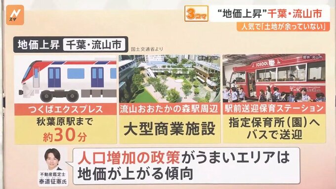 不動産鑑定士の泰道征憲氏は「人口増加の政策がうまいエリアは、地価が上がる傾向」としています。