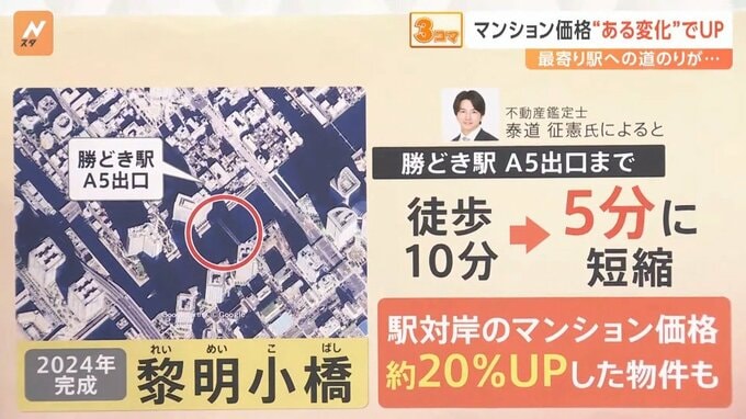 不動産鑑定士の泰道征憲氏によると、駅対岸のマンション価格が約20%アップした物件もあるということです。