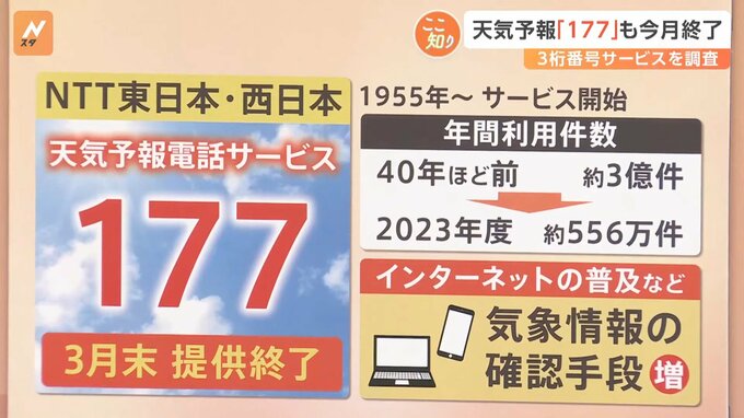 NTT東日本・西日本の天気予報電話サービス「177」の提供が3月末で終了します。