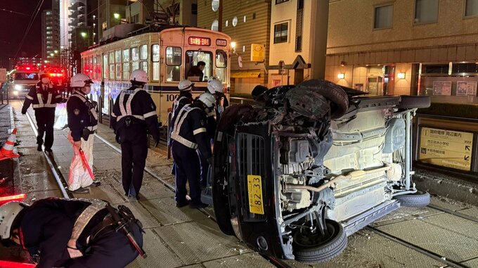 18日、熊本市中央区で乗用車が市電の軌道敷内で横転し、運転していた男性がけがをしました。記者「大きく破損した車が横転しています」18日午後7時40分ごろ、熊本市中央区の国府(こくぶ)電停付近で乗用車が軌道…
