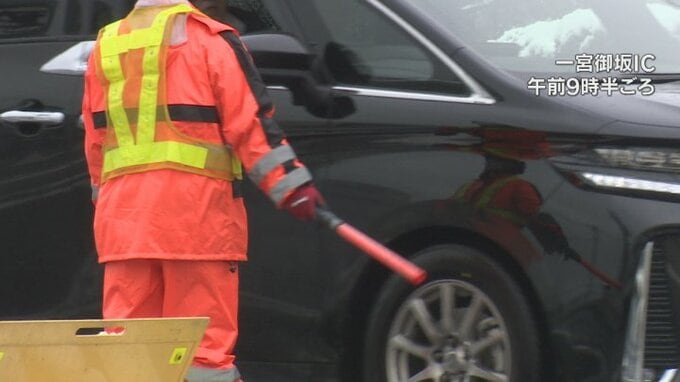 「午前9時半の一宮御坂ICです。現在通行止めの措置がとられ、Uターンをする車が見られます」
