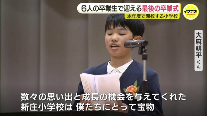 「数々の楽しい思い出と、大きな成長の機会を与えてくれた新庄小学校は、僕たちにとって宝物です。在校生のみなさん、大朝小学校でも、これまでの伝統を引き継ぎ、新庄っ子魂で頑張ってください」