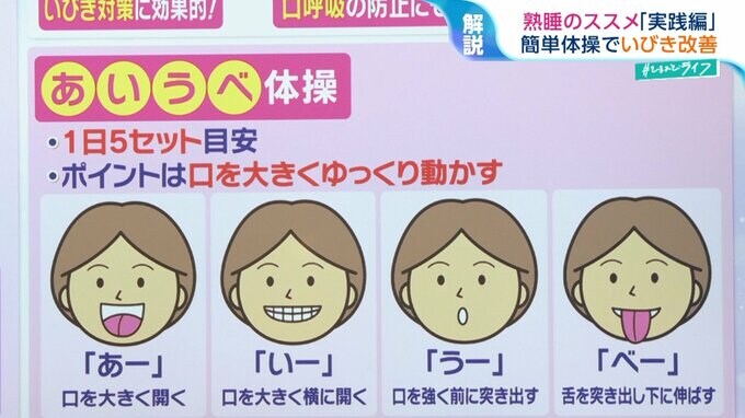 ゆっくり1秒ずつで大体4秒ですね。これを1日に5セットやることで、いびきの軽減が期待できます。