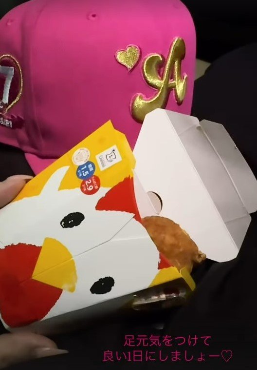 続く投稿で、「足元気をつけて 良い1日にしましょー♡」とピンクのキャップとコンビニエンスストアの唐揚げの写真を添えて注意を呼びかけました。