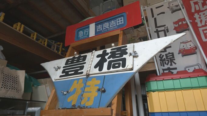 「これは(実際に)使われていた行き先の駅名を表示する板。イベントの時に展示させていただくと、鉄道の好きな大人や子どもたちが集まる。僕自身も名鉄西尾・蒲郡線を利用して高校に通っていた。息子や娘、孫も通学に使っていきたいと思っているので、何とか僕らの世代から次の世代へバトンタッチしていきたい熱い思いで頑張っている」