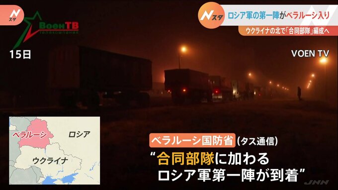 ウクライナ情勢です。ロシア軍の部隊が合同部隊を編成するため、ウクライナの北側に位置するベラルーシに到着しました。タス通信によりますと、ベラルーシ国防省は15日、合同部隊に加わるロシア軍の第一陣がベラル…