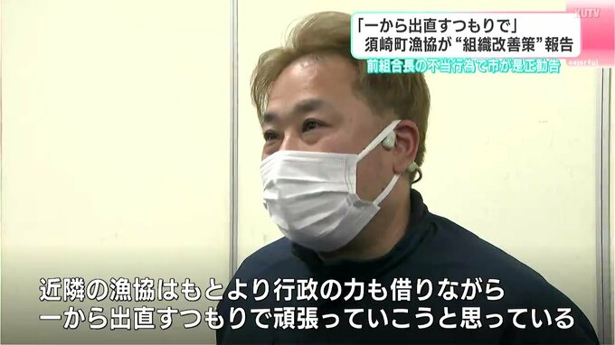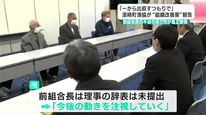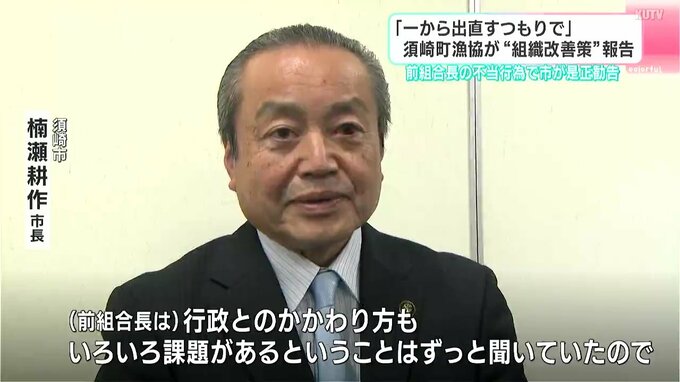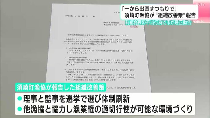2月、市内の4つの漁協が市に、組合長の解任などを求める要望書を提出。組合長は理事会で解任されています。市は3月5日、須崎町漁協に対し、「組織改善」を勧告。19日、須崎町漁協が、理事と監事を選挙で選んで体制を刷新することや、他の漁協と協力し、漁業権が適切に行使できる環境づくりを進めるなどの組織改善策を報告しました。