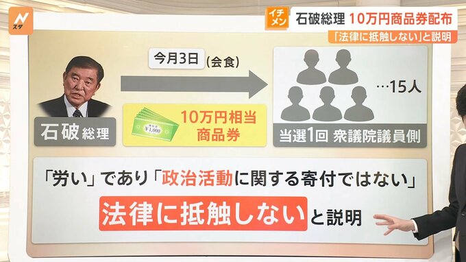 3月3日の会食です。石破総理が当選1回の衆議院議員側15人に対し、10万円相当の商品券を配布。「労い」であって「政治活動に関する寄付ではない法律には抵触しない」と説明しています。