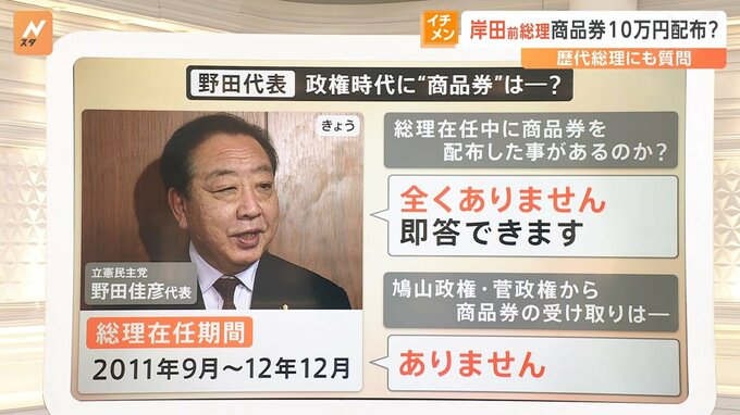 また、「鳩山政権・菅政権から商品券の受け取りはあったのか?」という質問に対しては「ありません」と答えています。
