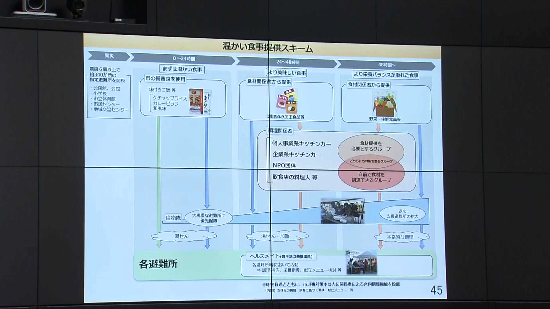 福岡市は、発災から24時間後まで、24時間後から48時間後までなど、時間の経過に従って非常食の質を上げていく方針を示しました。