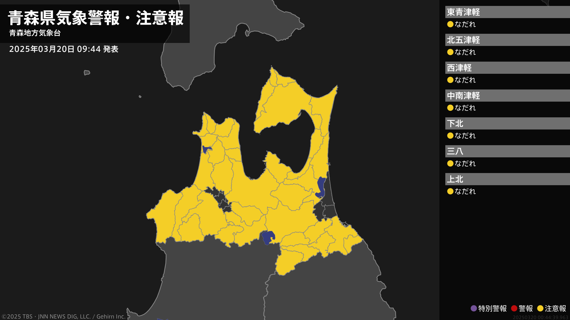 気象台は、午前9時44分に、なだれ注意報を青森市、弘前市、八戸市、黒石市、五所川原市、十和田市、むつ市、つがる市、平川市、平内町、今別町、蓬田村、外ヶ浜町、鰺ヶ沢町、深浦町、西目屋村、大鰐町、中泊町、野辺地町、七戸町、横浜町、東北町、六ヶ所村、大間町、東通村、風間浦村、佐井村、三戸町、五戸町、田子町、南部町、階上町、新郷村に発表しました。