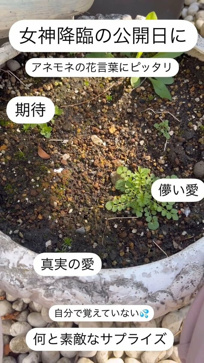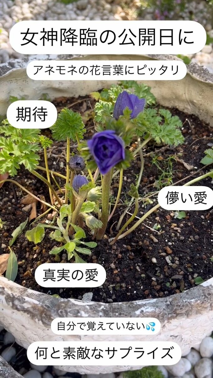工藤さんは動画に「女神降臨の公開日に」と、次女のKōki,さんの主演映画の公開日であることを知らせるテロップを入れつつ、「アネモネの花言葉にピッタリ 期待 儚い愛 真実の愛」と添えていて、この花の発見を “吉兆” と捉えている模様。さらに「自分で覚えていない」「なんと素敵なサプライズ」と、忘れてしまっていた花に再会した運命的な喜びを表現しています。