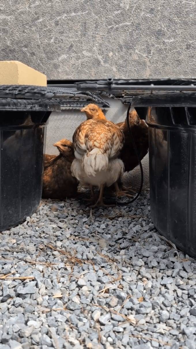 投稿された動画では、台の隙間と、金網の下に出来た小さな空間に、3羽のニワトリが、身体を寄せ合って隠れている様子が見て取れます。
