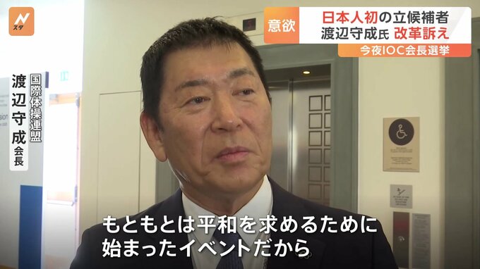 IOC=国際オリンピック委員会の会長選挙が日本時間の今夜、ギリシャで行われます。日本人として初めて立候補している国際体操連盟の渡辺守成会長がJNNの取材に応じました。記者「IOC会長選の立候補者たちが各国の…