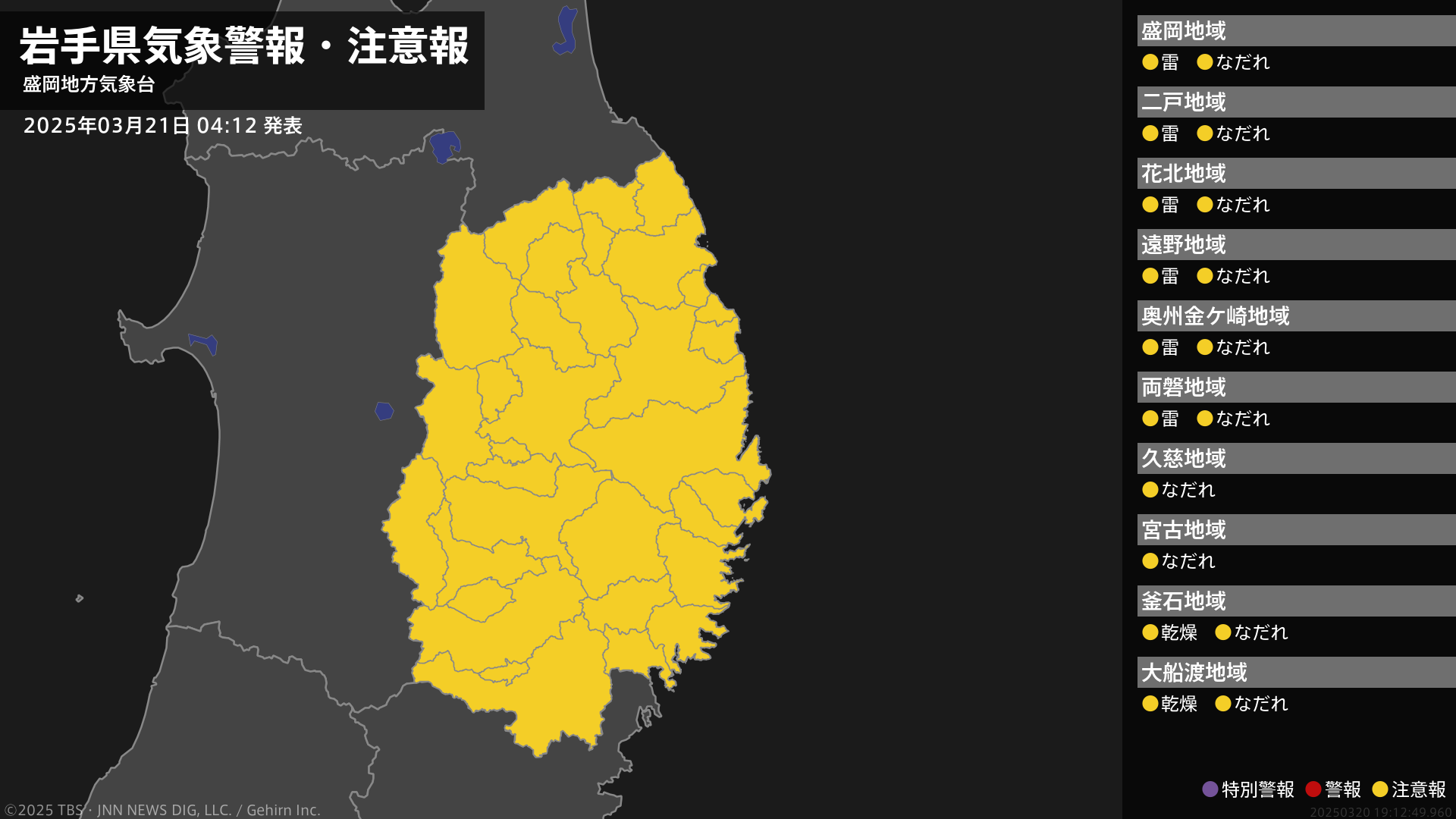 気象台は、午前4時12分に、なだれ注意報を盛岡市、宮古市、大船渡市、花巻市、北上市、久慈市、遠野市、一関市、陸前高田市、釜石市、二戸市、八幡平市、奥州市、滝沢市、雫石町、葛巻町、岩手町、紫波町、矢巾町、西和賀町、金ケ崎町、住田町、大槌町、山田町、岩泉町、田野畑村、普代村、軽米町、野田村、九戸村、洋野町、一戸町に発表しました。