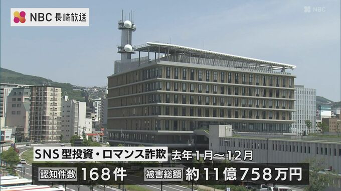 SNSを通じて投資話などを持ちかけ金をだまし取る「SNS型投資・ロマンス詐欺」について、長崎県警は去年から統計を始めていて、去年1年間に県内で認知された被害件数は168件、被害総額はおよそ11億758万円にのぼりました。
