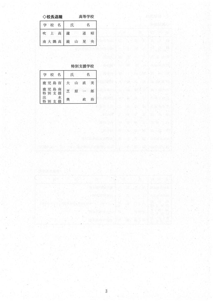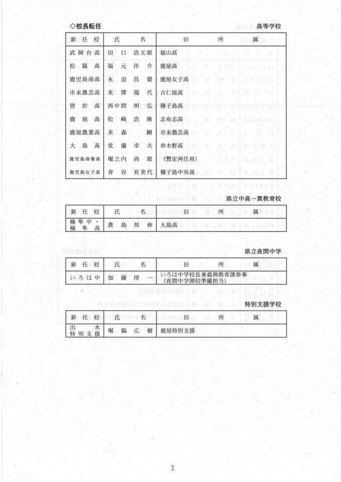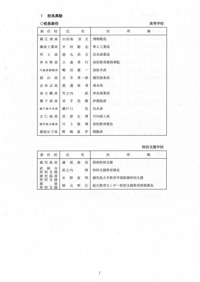 校長新任は、高等学校では錦江湾、薩南工業、吹上、串木野、川薩清修館、福山、志布志、南大隅、種子島、種子島中央、古仁屋、鹿児島玉龍、鹿屋女子です。