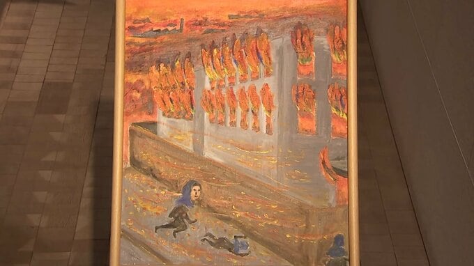 豊田さんが描いた当時の様子の絵では、建物の窓から火が吹き出している。