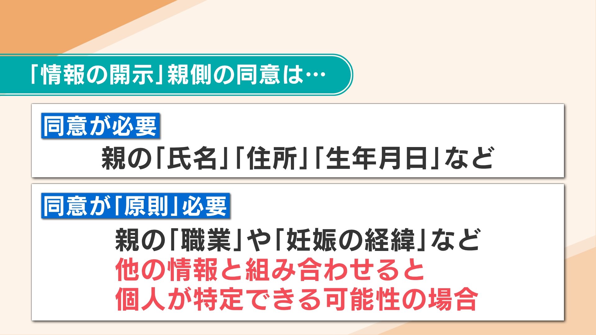 開示にあたって、氏名、住所、生年月日などは親の同意が必要です。また、職業や妊娠の経緯など他の情報と組み合わせると個人が特定できる可能性がある場合も、原則として親の同意が必要です。