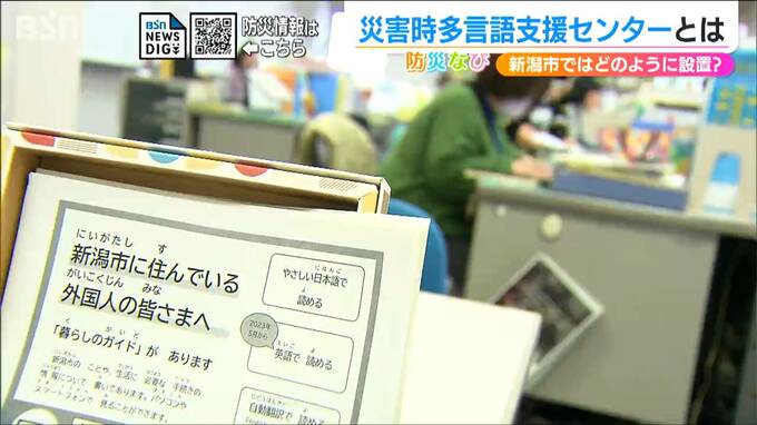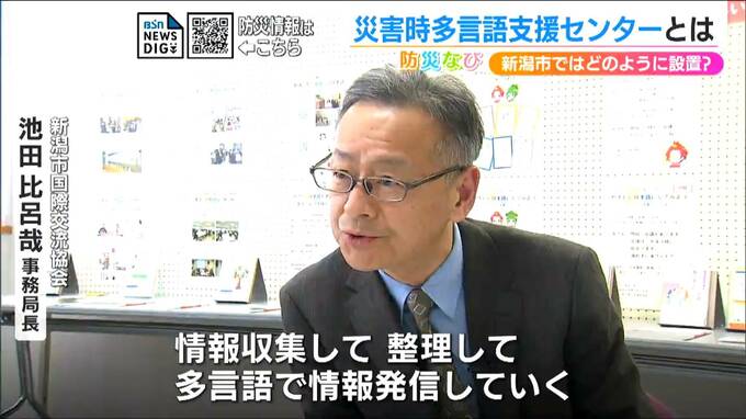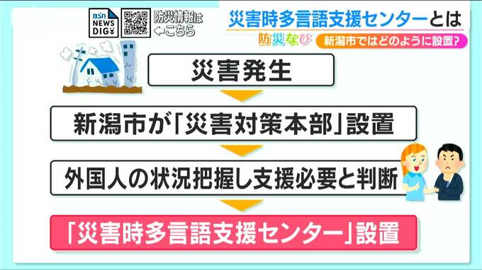 新潟市では発災後、災害対策本部が避難所に避難している外国人の数などを把握して必要と判断した際に、新潟市国際交流協会内で『災害時多言語支援センター』の本部が設置されます。