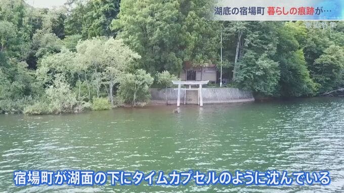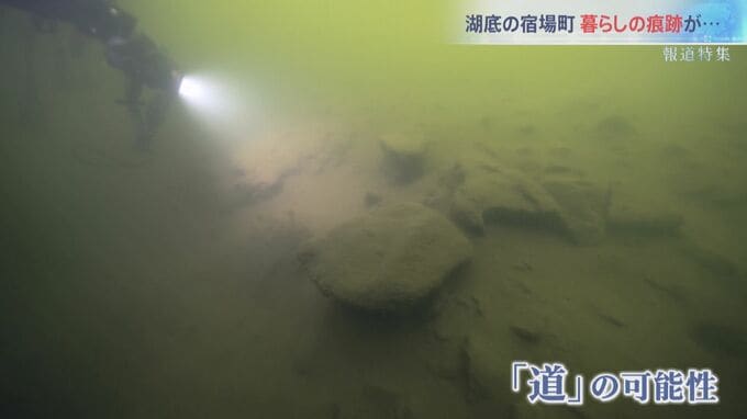 この日、木村たちが調査したのは水没鳥居の南東付近。ここには神社の参道にあったような大きな切り株が。そして、石が散乱しているように見える場所。周囲より盛り上がっていて、道だった可能性があるという。