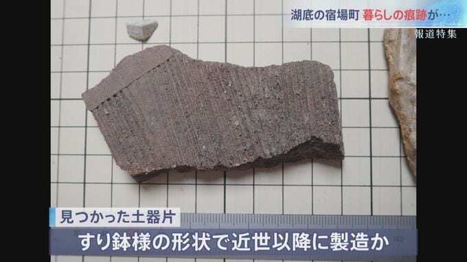 「災害の混乱で割れてしまったのか、想像は色々できる。採取した点数はそれほど多くないんですけど、そこに陶器(土器片)と考えられるものが混ざってくる。宿場町が湖面の下にタイムカプセルのように沈んでいるということがサンプルを取った結果からもわかってくるのでは」