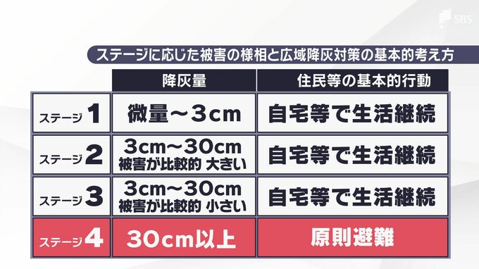 降灰量が30センチ未満のステージ1から3では、原則、自宅での生活を続けるよう求め、降灰量が30センチ以上のステージ4では原則、避難を促す方針が示されました。そのうえで、影響の長期化に備えて1週間分の備蓄を推奨し、可能であれば、2週間分の備蓄を備えておくことが望ましいとしました。