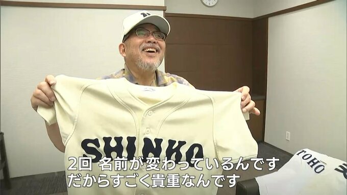 「それで出来たのがこれです。これ、全然違うでしょ。これが昭和29年に優勝した当時のもののデザインと素材に近づけて作ったもの。だからこれ、オンリーワンです。今回のために作ったものです。このユニフォームは多分野球をやっていた人にとっては懐かしいと思うんです。こういうような綿とポリエステルの混紡の。安っぽい感じのユニフォームを僕らは着てやってて。そのころのユニフォームに近いと思う」