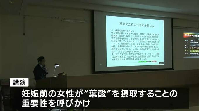 妊娠中または妊娠予定の若い男女が心身共に健康に過ごすプレコンセプションケアなどについて理解を深めてもらおうと開かれたもので、講演では妊娠前の女性が「葉酸(ようさん)」を摂取することで「神経管閉鎖障害」という新生児の先天異常を抑制につながるという報告が行われ、葉酸摂取の重要性を呼びかけていました。