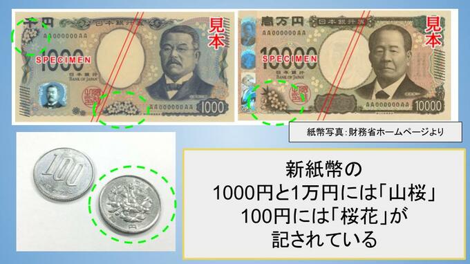 それはお財布に入っている紙幣と硬貨。よく見ると新紙幣の1000円札と1万円札には「山桜」、100円硬貨には「桜花」が印字・刻印されています。
