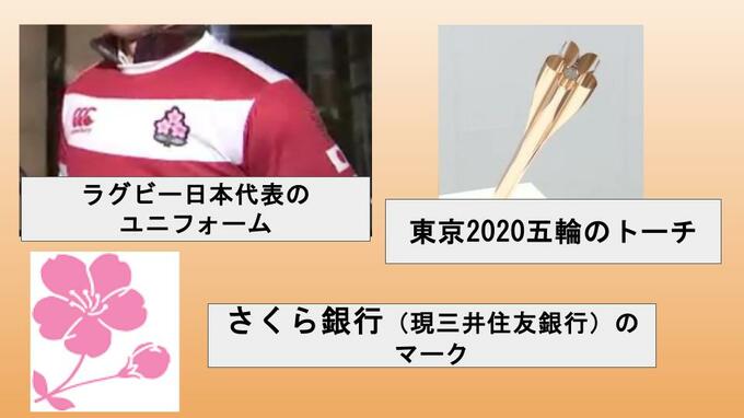 さらにラグビー日本代表のユニフォームや東京2020五輪のトーチ、さくら銀行(現三井住友銀行)のロゴなど桜を模した物がいろいろあります。