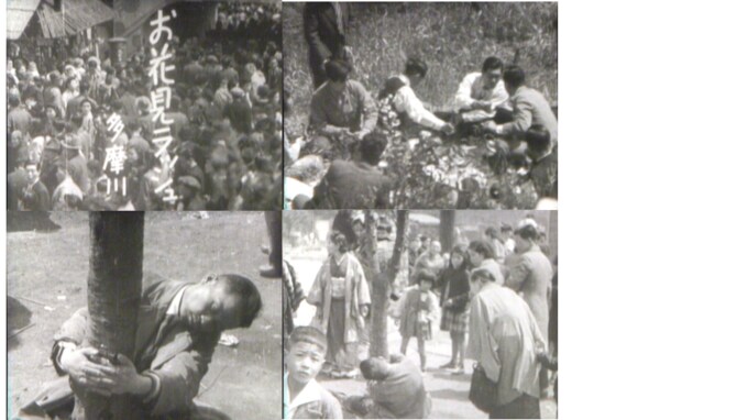 現在と変わらず、咲き誇る桜の下を散歩する様子や三味線の伴奏で歌を歌ったり、宴会をする様子が映っていました。