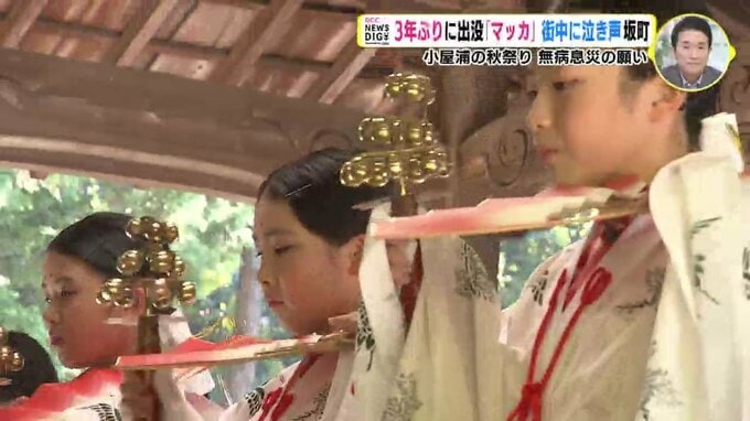 マッカたちの大暴れも午後3時前には終わり、神事が執り行われました。神主が祝詞をあげ、地元の小学生たちが、笛や太鼓の祭ばやしに合わせて、巫女舞を奉納します。