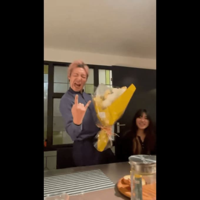 そして「卒業式を終えて短大時代からの同志(しかもご近所)と藤沢で祝杯をあげて帰宅したら、ちょうど帰国中の次女がなんと彼氏と花を選んで買って来てくれました」と、次女から花束を受ける動画をアップしました。