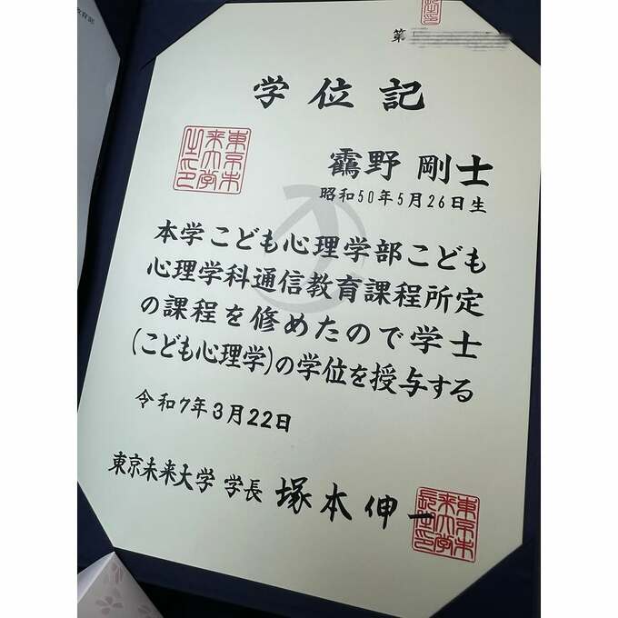そして「短大卒業式以来の卒業式、あっという間やら長かったやら。。」「学位記とともに"認定心理士資格"取得単位も全ていただきました。」「50歳を迎える前に大学卒業を目標にしていたので夢叶いました」と、記しました。