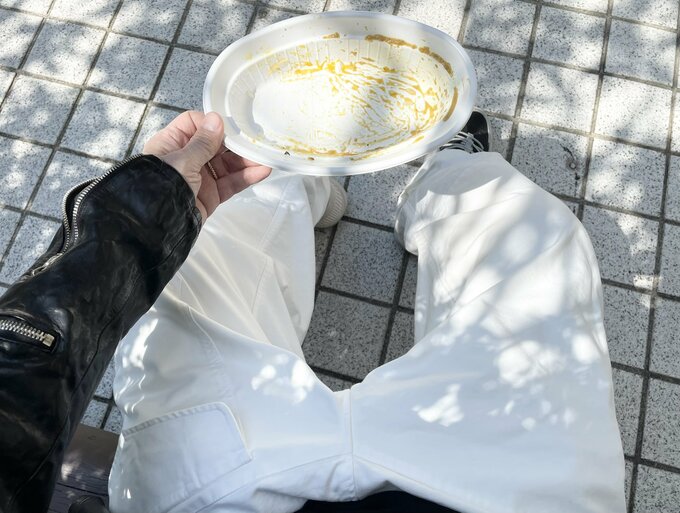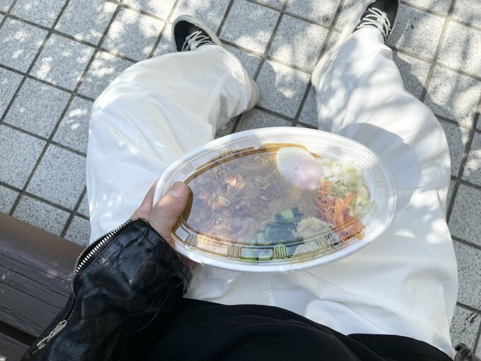 山寺さんは「公園のベンチで食べようとカレーをテイクアウトしたが、」とベンチに座って撮影したカレーの写真を投稿。