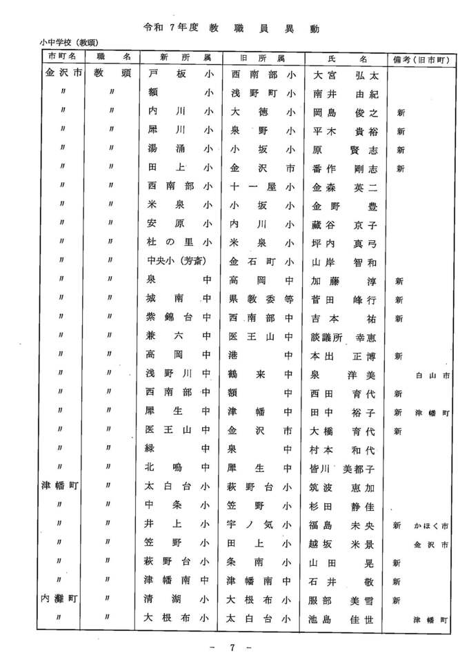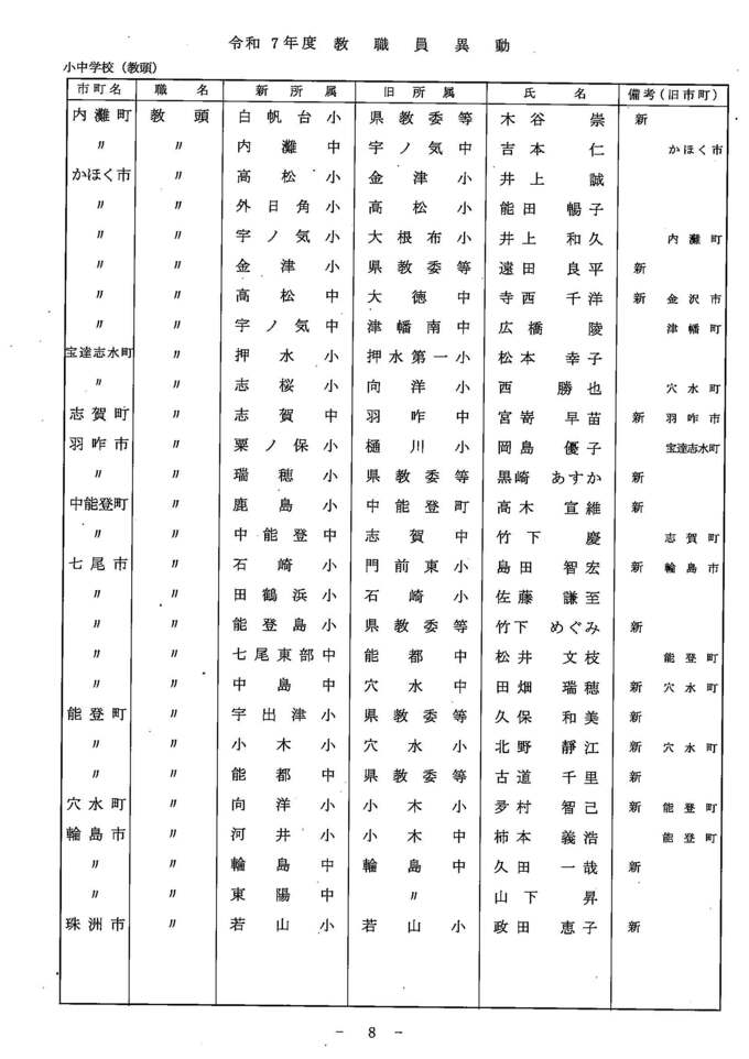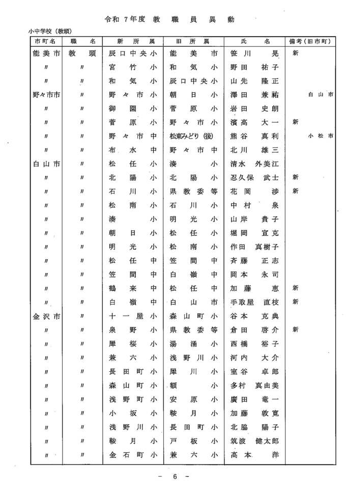 教職員人事異動2025 石川県 「あの先生はどこに?」全名簿掲載・令和7年度…小学校・中学校・高校・特別支援学校 北陸放送 2025年3月24日(月) 14:00 国内 異動する教職員一覧【小中学校 教頭】 小中学校 教頭(石川県教委発表) 小中学校 教頭(石川県教委発表) 小中学校 教頭(石川県教委発表) 小中学校 教頭(石川県教委発表)