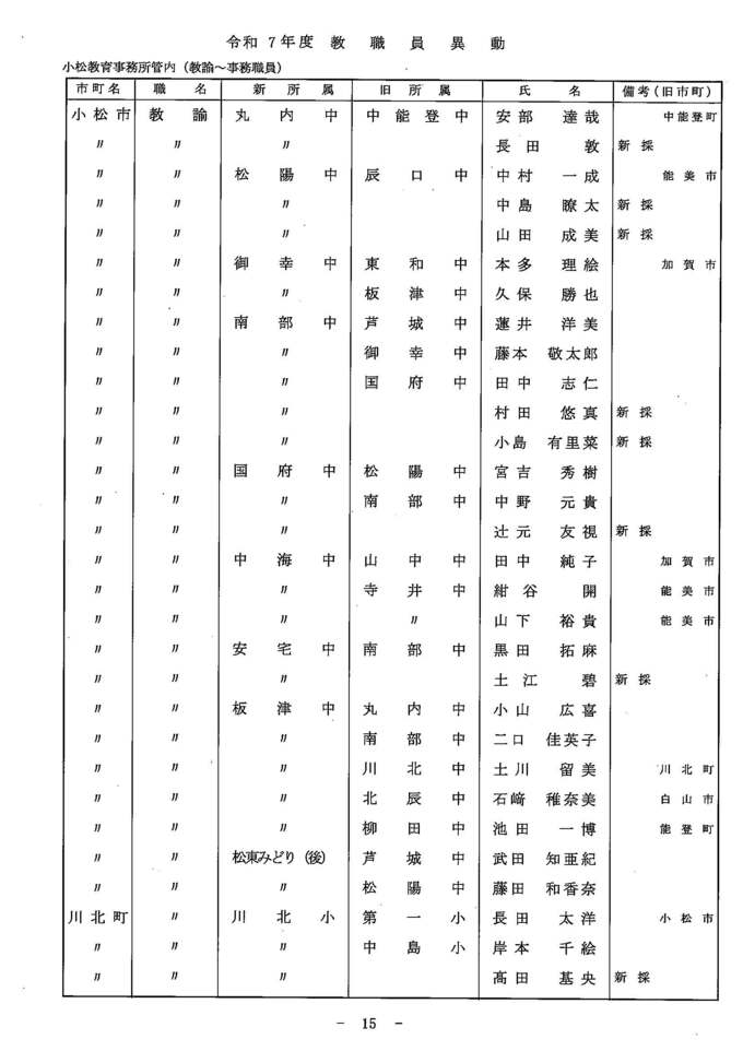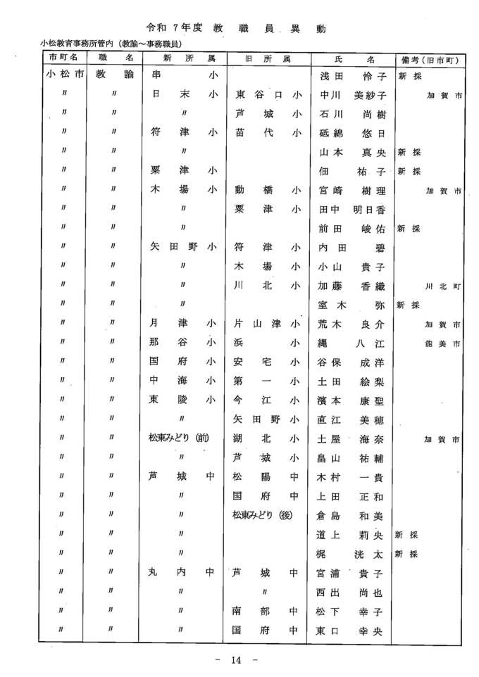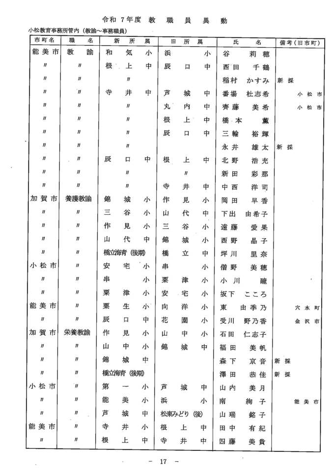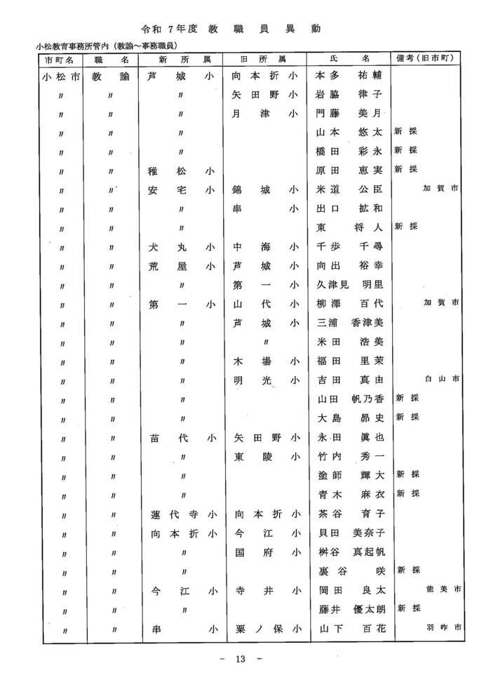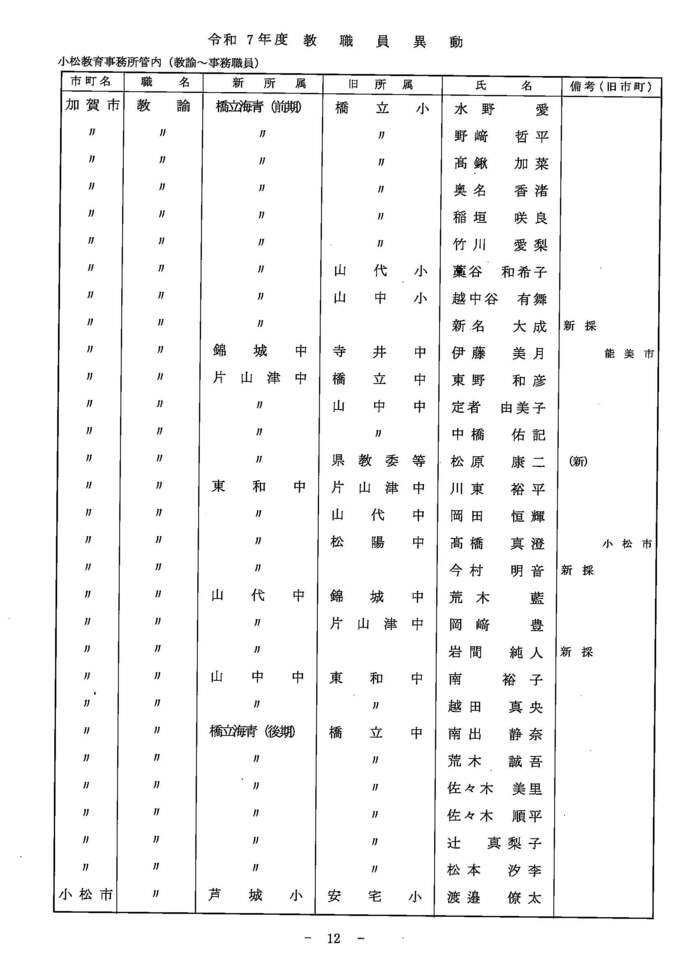 教職員人事異動2025 石川県 「あの先生はどこに?」全名簿掲載・令和7年度…小学校・中学校・高校・特別支援学校 北陸放送 2025年3月24日(月) 14:00 国内 異動する教職員一覧【小中学校 教諭・養護教諭・栄養教諭・事務職員(小松教育事務所管内)】 小中学校 教諭・養護教諭・栄養教諭・事務職員(小松教育事務所管内) 小中学校 教諭・養護教諭・栄養教諭・事務職員(小松教育事務所管内) 小中学校 教諭・養護教諭・栄養教諭・事務職員(小松教育事務所管内) 小中学校 教諭・養護教諭・栄養教諭・事務職員(小松教育事務所管内) 小中学校 教諭・養護教諭・栄養教諭・事務職員(小松教育事務所管内) 小中学校 教諭・養護教諭・栄養教諭・事務職員(小松教育事務所管内) 小中学校 教諭・養護教諭・栄養教諭・事務職員(小松教育事務所管内) 小中学校 教諭・養護教諭・栄養教諭・事務職員(小松教育事務所管内)
