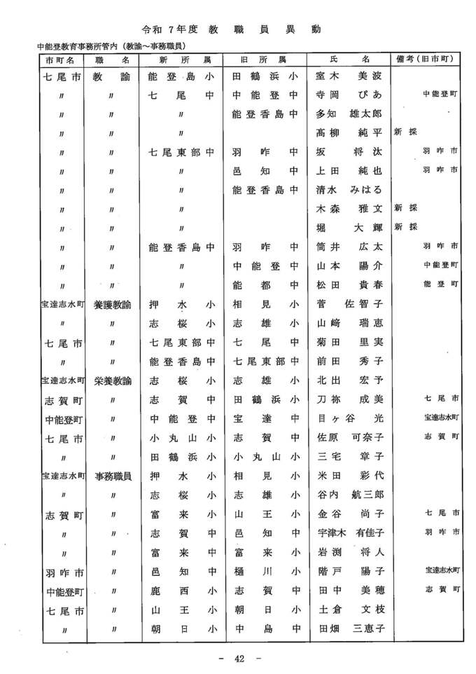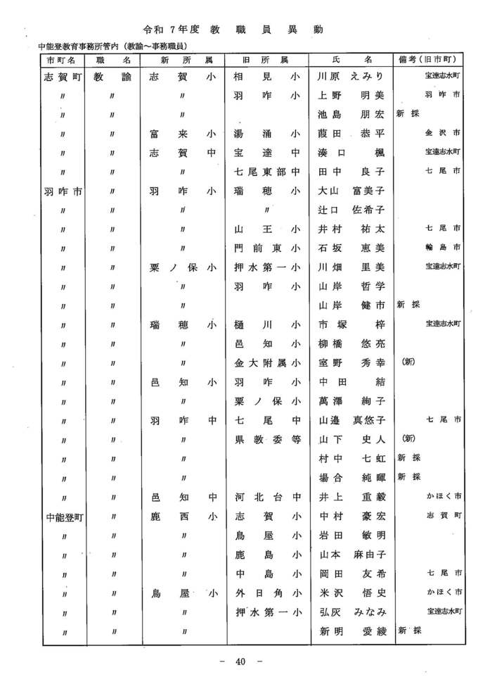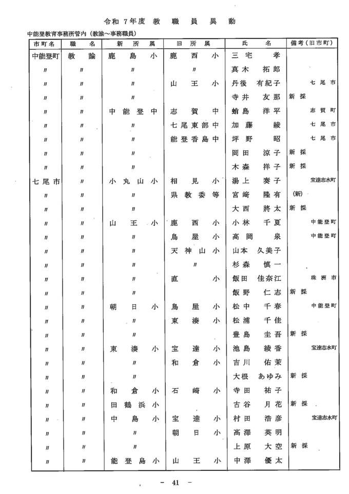 教職員人事異動2025 石川県 「あの先生はどこに?」全名簿掲載・令和7年度…小学校・中学校・高校・特別支援学校 北陸放送 2025年3月24日(月) 14:00 国内 異動する教職員一覧【小中学校 教諭・養護教諭・栄養教諭・事務職員(中能登教育事務所管内)】 小中学校 教諭・養護教諭・栄養教諭・事務職員(中能登教育事務所管内) 小中学校 教諭・養護教諭・栄養教諭・事務職員(中能登教育事務所管内) 小中学校 教諭・養護教諭・栄養教諭・事務職員(中能登教育事務所管内) 小中学校 教諭・養護教諭・栄養教諭・事務職員(中能登教育事務所管内) 小中学校 教諭・養護教諭・栄養教諭・事務職員(中能登教育事務所管内)