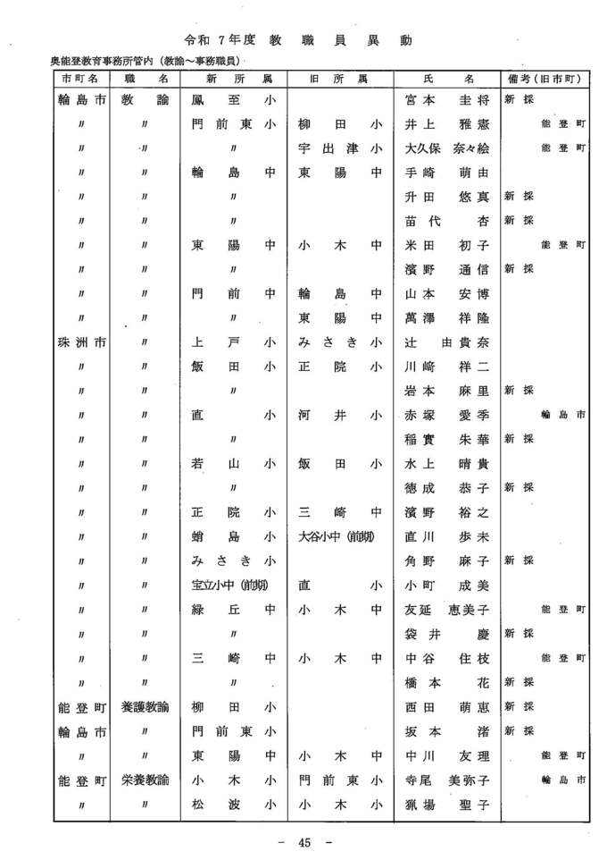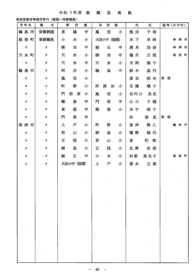 教職員人事異動2025 石川県 「あの先生はどこに?」全名簿掲載・令和7年度…小学校・中学校・高校・特別支援学校 北陸放送 2025年3月24日(月) 14:00 国内 異動する教職員一覧【小中学校 教諭・養護教諭・栄養教諭・事務職員(奥能登教育事務所管内)】 小中学校 教諭・養護教諭・栄養教諭・事務職員(奥能登教育事務所管内) 小中学校 教諭・養護教諭・栄養教諭・事務職員(奥能登教育事務所管内) 小中学校 教諭・養護教諭・栄養教諭・事務職員(奥能登教育事務所管内)