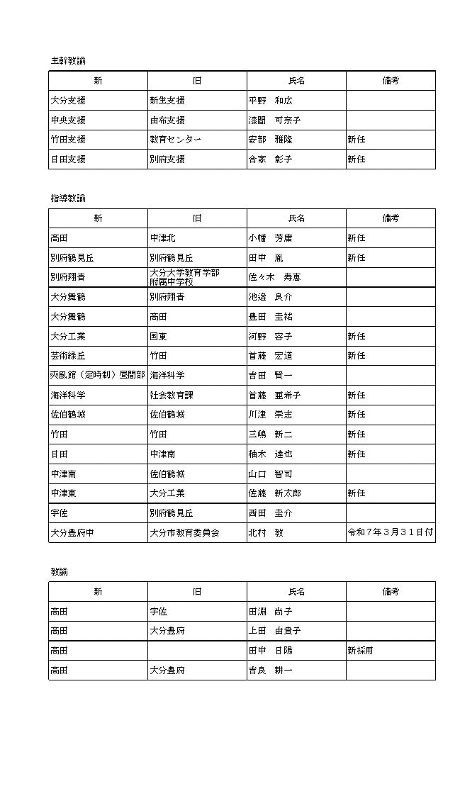 3. 大分県教職員人事異動2025「あの先生、かわるん?」県立中学・高校・特別支援学校の一般職員【異動職員名簿掲載】